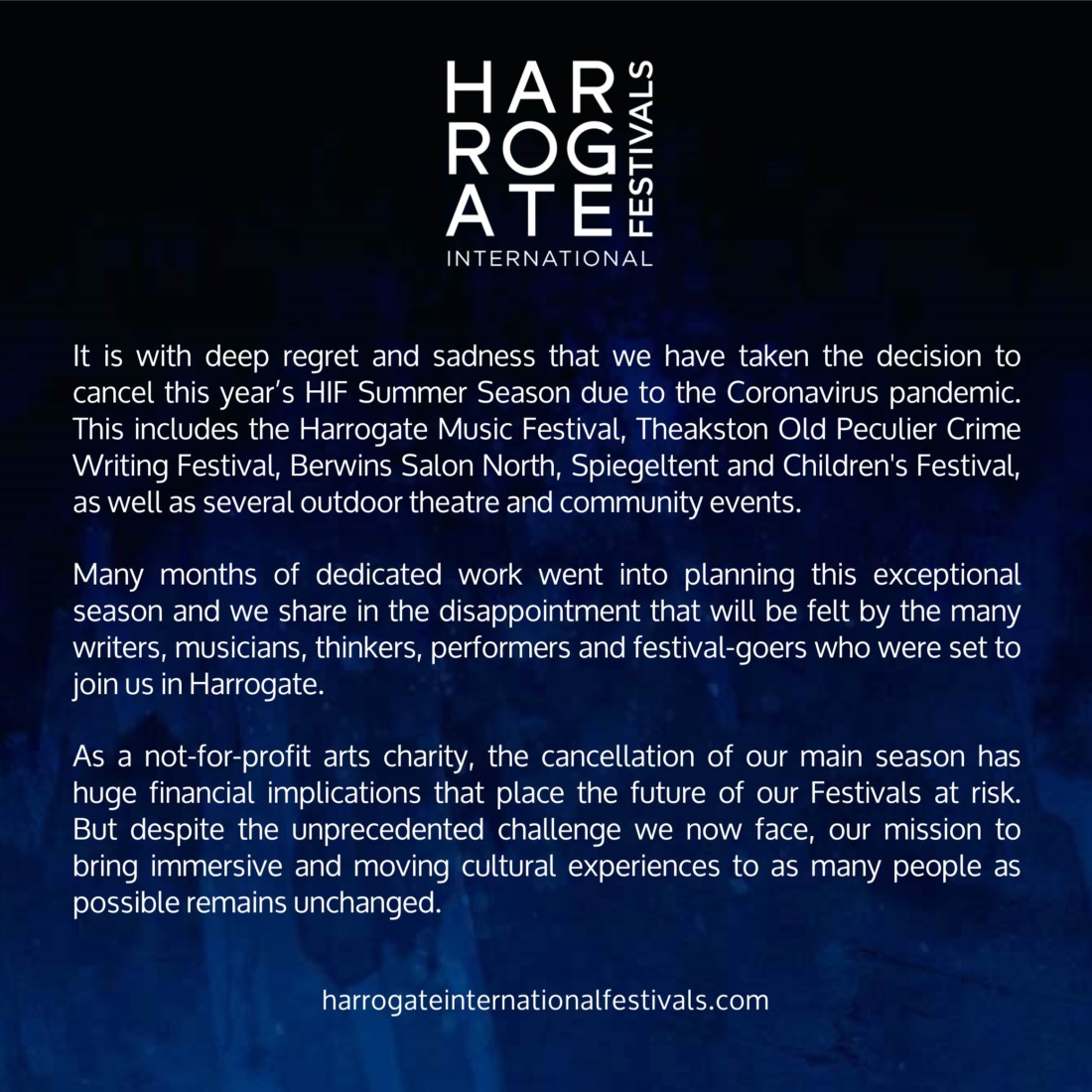 Many months of dedicated work went into planning this exceptional season and we share in the disappointment that will be felt by the many writers, musicians, thinkers, performers and festival-goers who were set to join us in Harrogate.